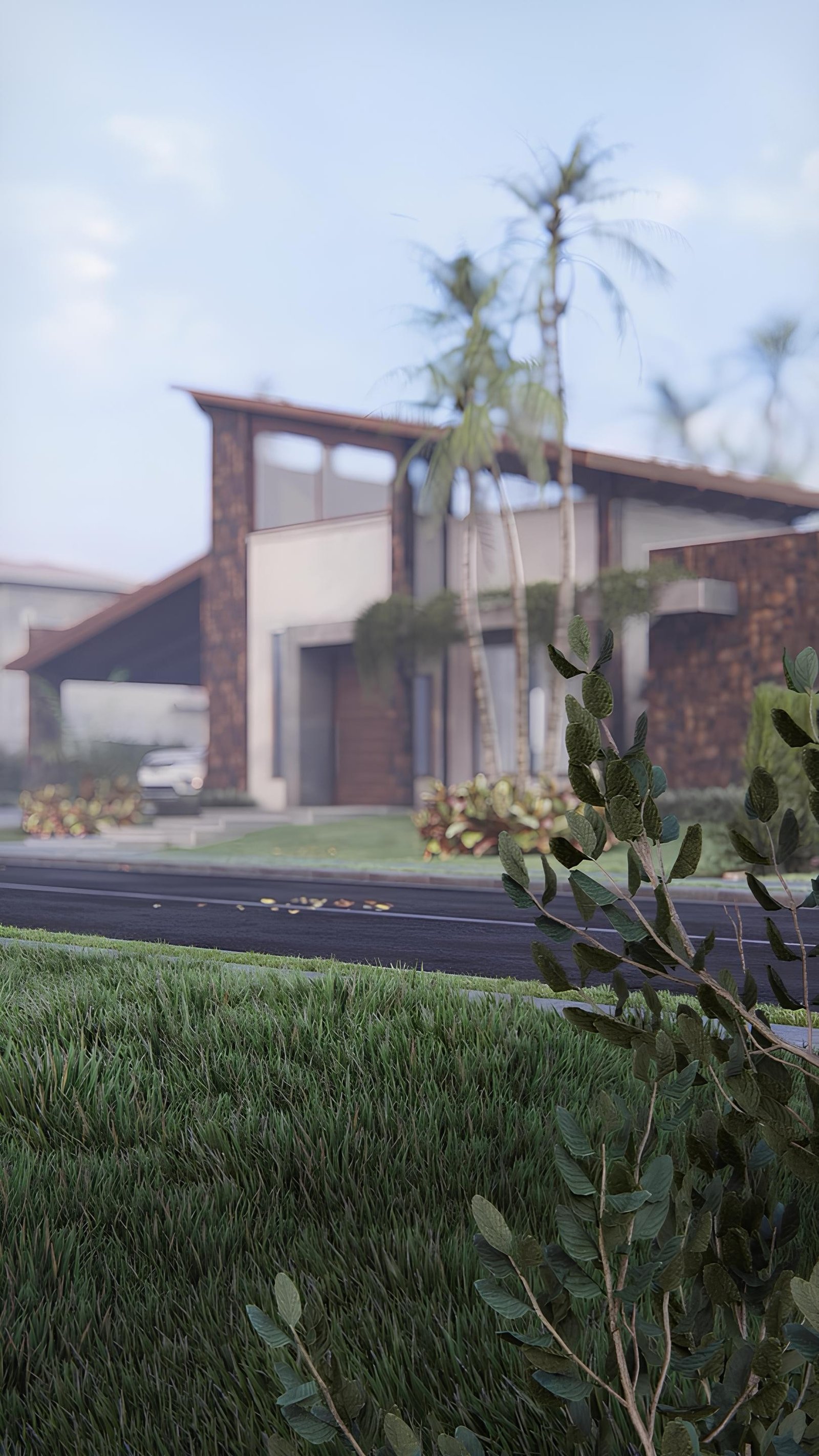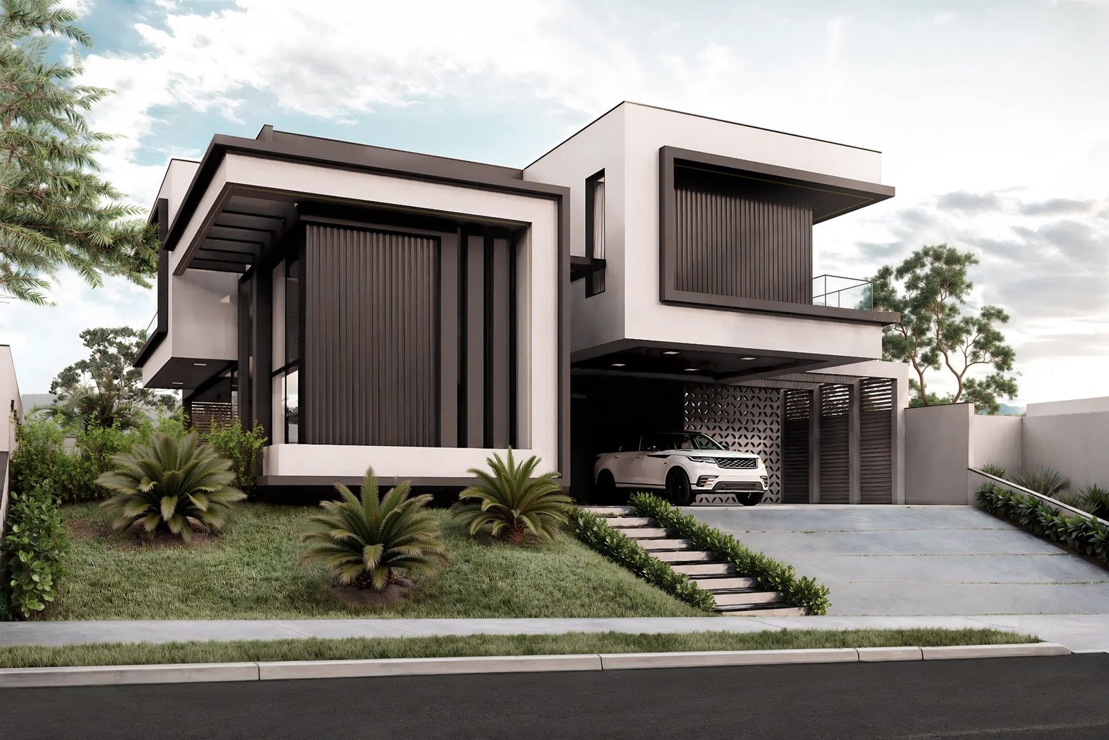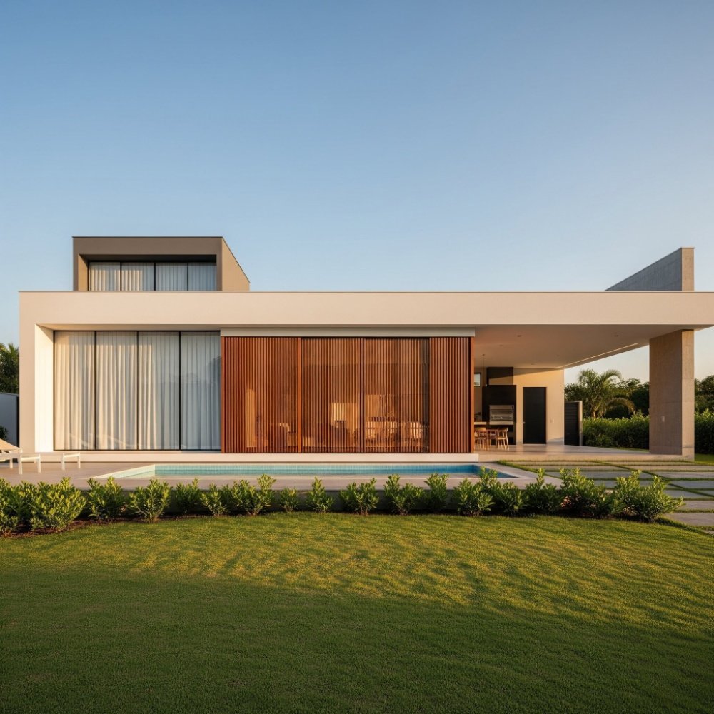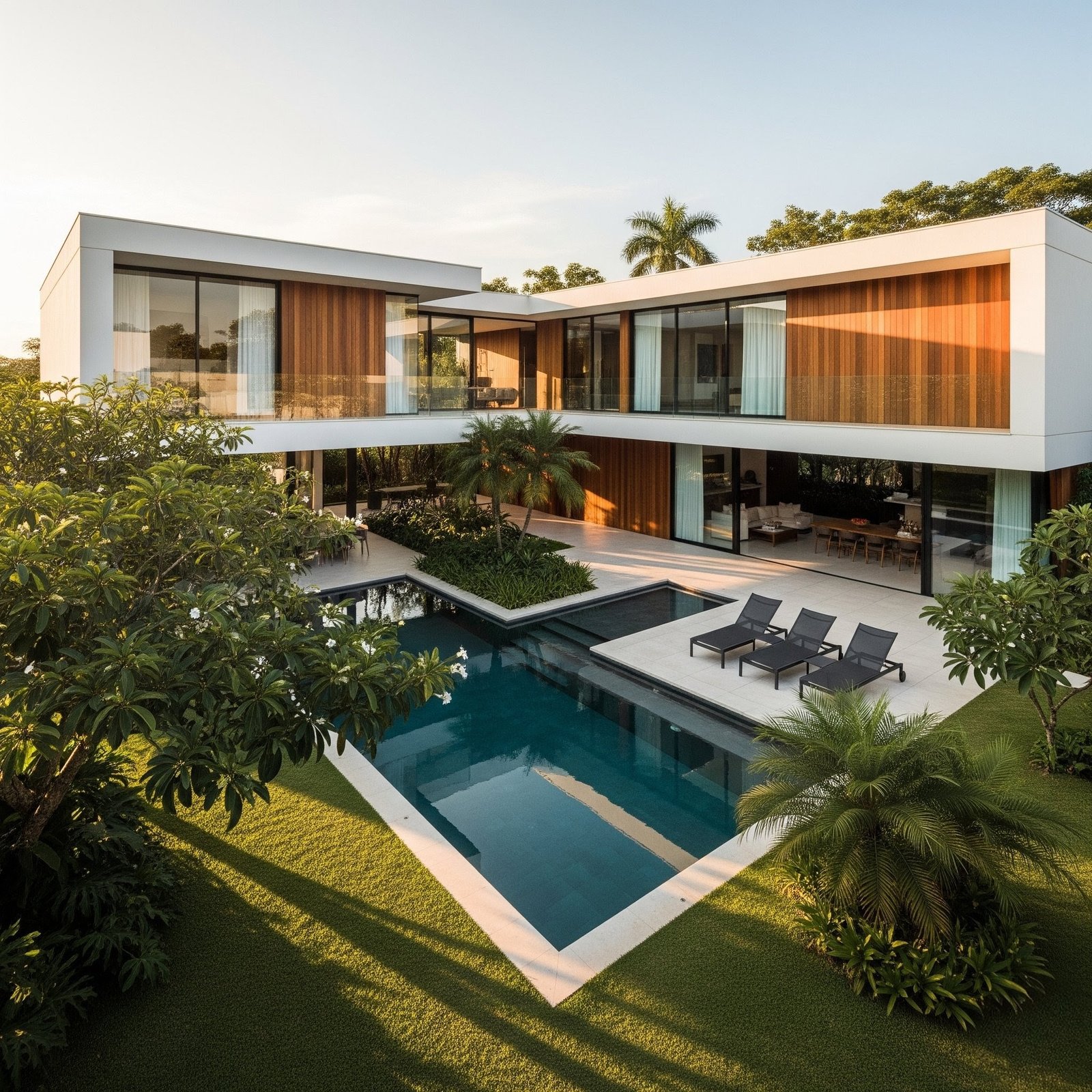 Arquitetura contemporânea minimalista com integração total entre interior e exterior. Piscina elevada emoldurada por jardim tropical, sob a luz suave do fim de tarde: um convite ao bem-viver.